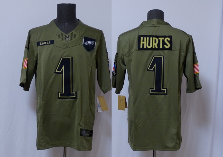 Philadelphia Eagles #1 Jalen Hurts Green 2025 Salute to Service Limited Jersey inspired by what he's wearing on the field,