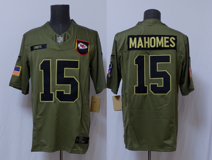 Kansas City Chiefs #15 Patrick Mahomes Green 2025 Salute to Service Limited Jersey inspired by what he's wearing on the field,